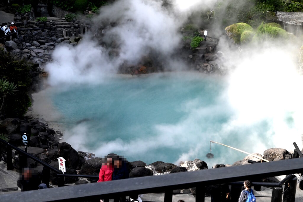 湯煙の隙間から時折見える温泉は海よりも鮮やかな青色をしています。