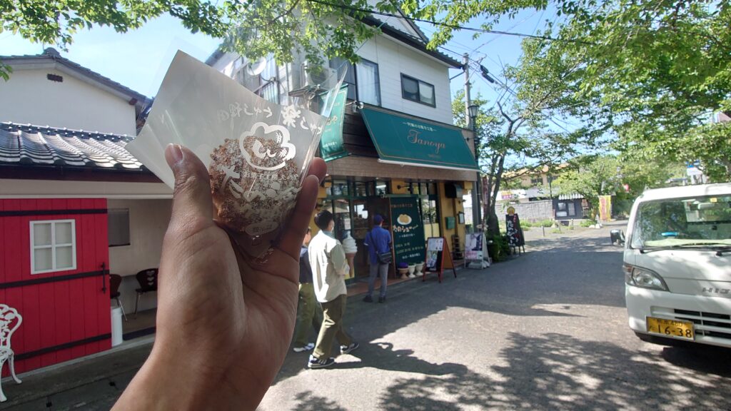 香りに誘われるがまま阿蘇お菓子工房たのやさんへ入りたのシューを頂きます。