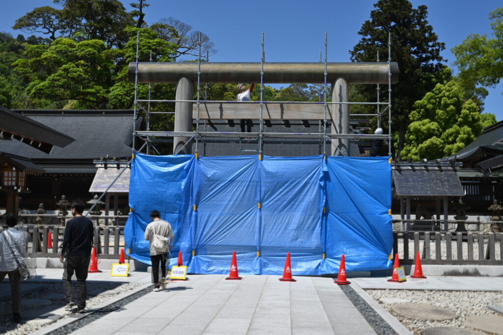 鳥居は掃除中のようで、足場が組まれやすりがけをしていました。