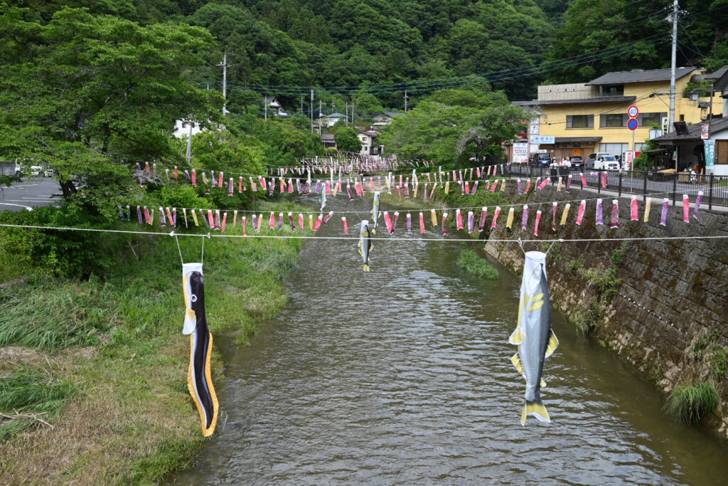 駐車場にバイクを置いて滝へ向かう途中、川にかかる鯉のぼりを見つけました。