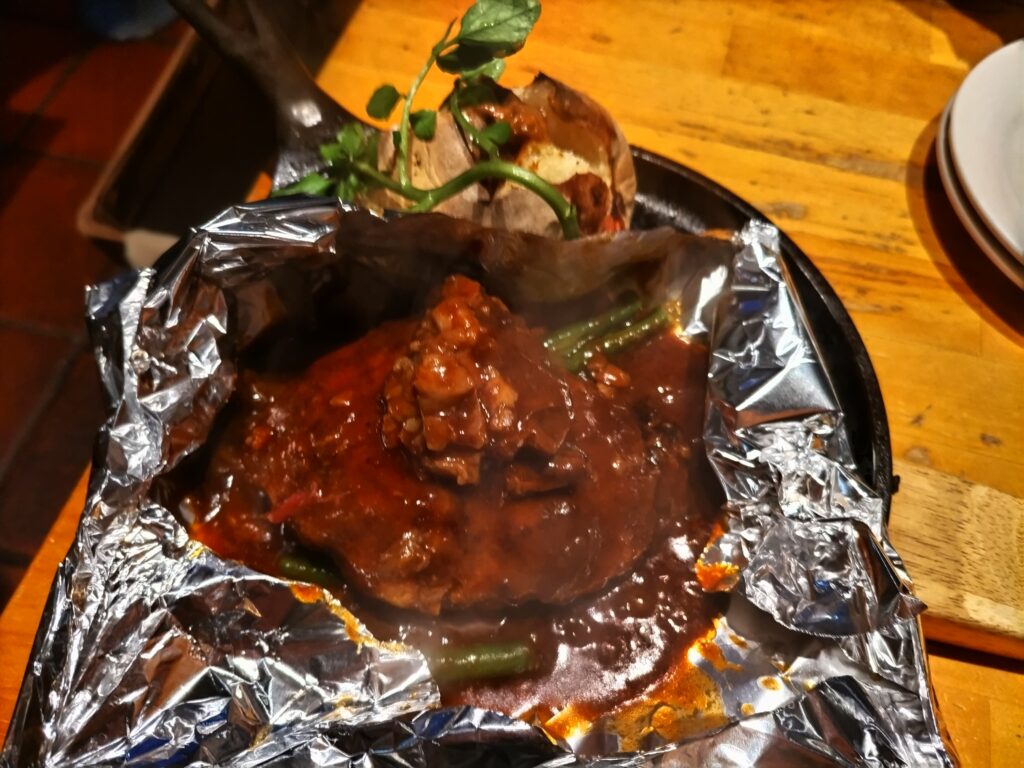 アルミホイルで包み焼きにされたジューシーなハンバーグが美味しかったです。