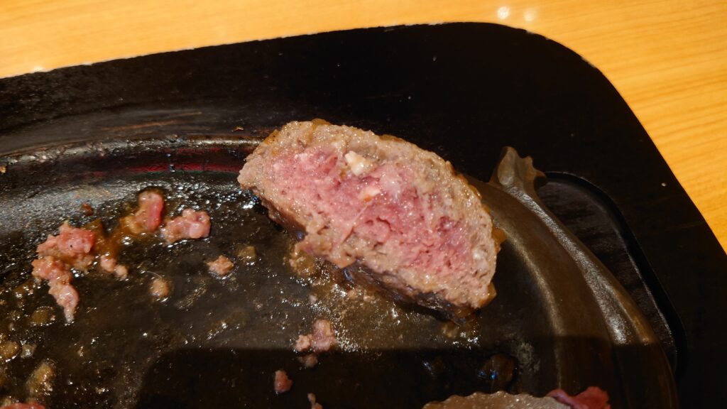 挽肉のレアは普通は危険ですが、さわやかさんでは工場で徹底的に品質を管理して製造している為このような肉々しいハンバーグを頂く事が出来ます。