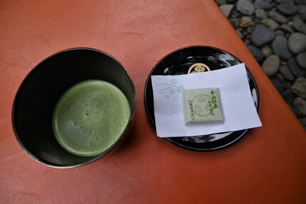 参拝を終えて戻る途中にある神楽殿で抹茶を頂くことが出来たので休憩ついでに頂いていきます。
