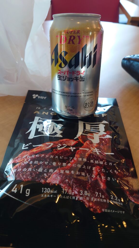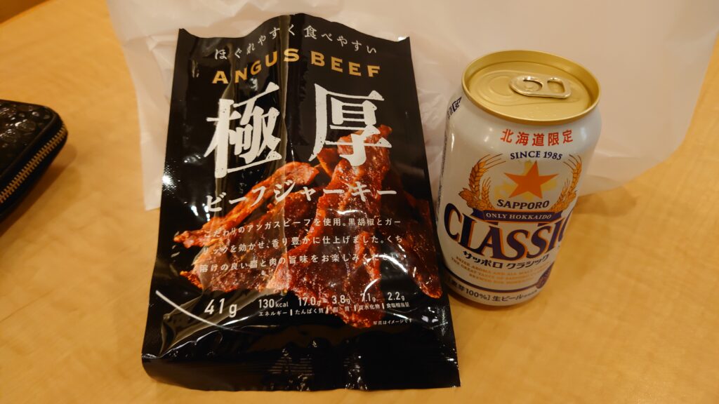 イオンで生ジョッキ缶を買い、昨日セコマで買っておいたジャーキーを齧ります。