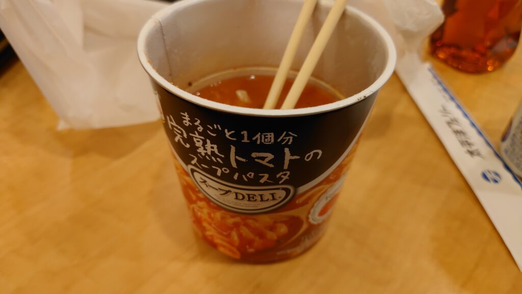 お酒を飲み終えたら晩御飯に買っておいたトマトスープパスタを頂きます。