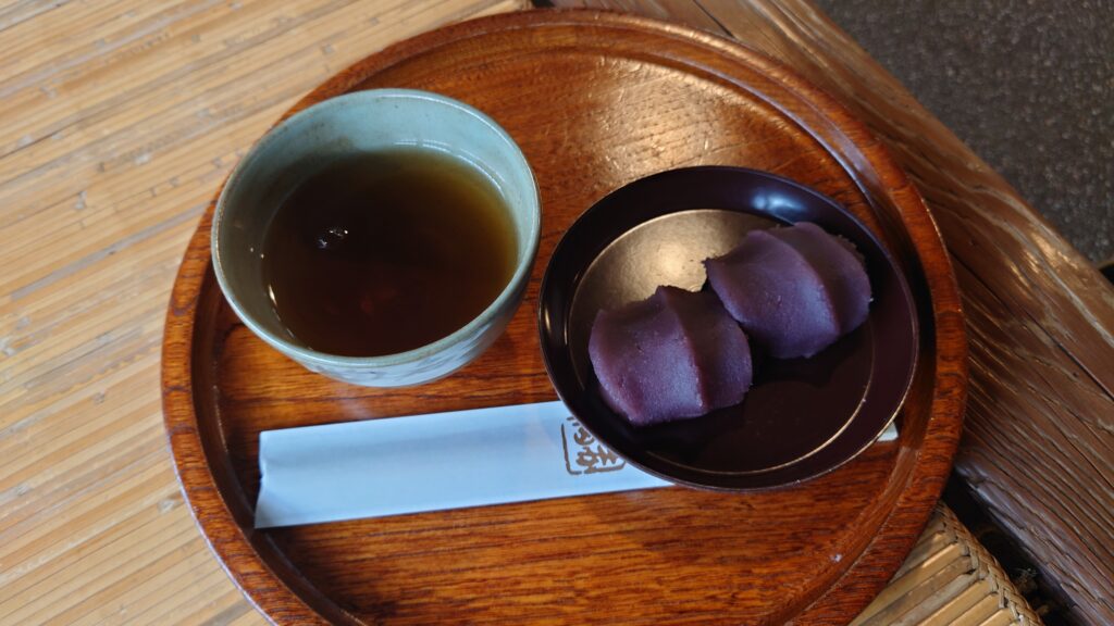店内で熱々のお茶で赤福餅を頂きます。